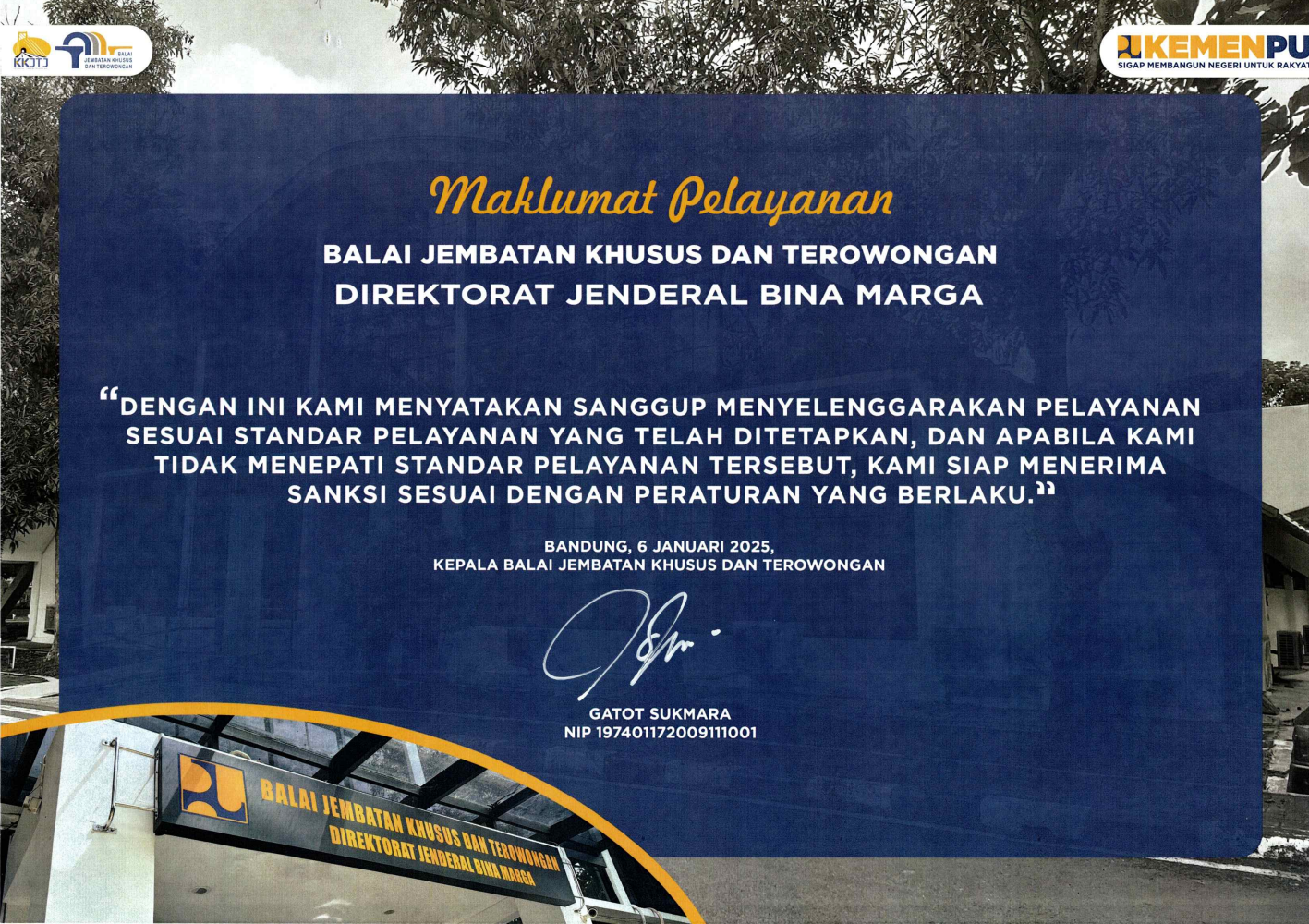Dengan ini kami Balai Jembatan Khusus dan Terowongan (sekretariat KKJTJ) menyatakan kesanggupan untuk menyelenggarakan pelayanan sesuai dengan standar yang telah ditetapkan. Apabila kami tidak dapat memenuhi standar pelayanan tersebut, kami siap menerima sanksi sesuai dengan peraturan yang berlaku.