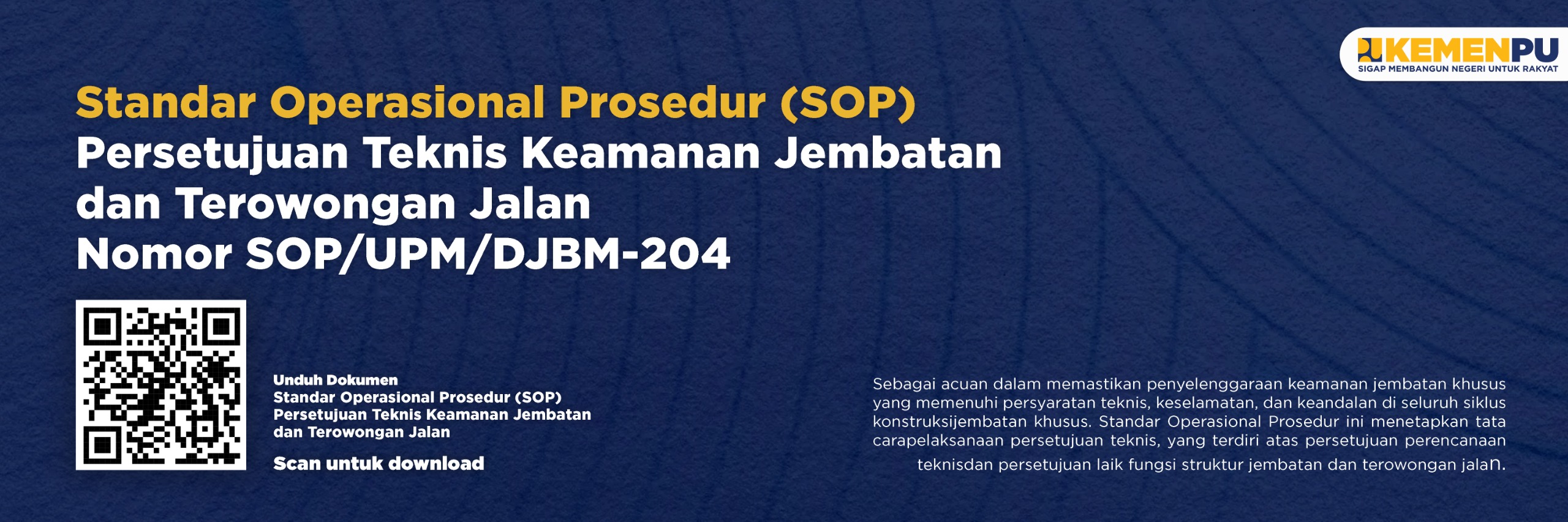 Telah diterbitkan Standar Operasional Prosedur (SOP) Persetujuan Teknis Keamanan Jembatan dan Terowongan Jalan Nomor SOP/UPM/DJBM-204 sebagai bagian dari Norma, Standar, Prosedur, dan Kriteria (NSPK) Bidang Jembatan dan Terowongan.